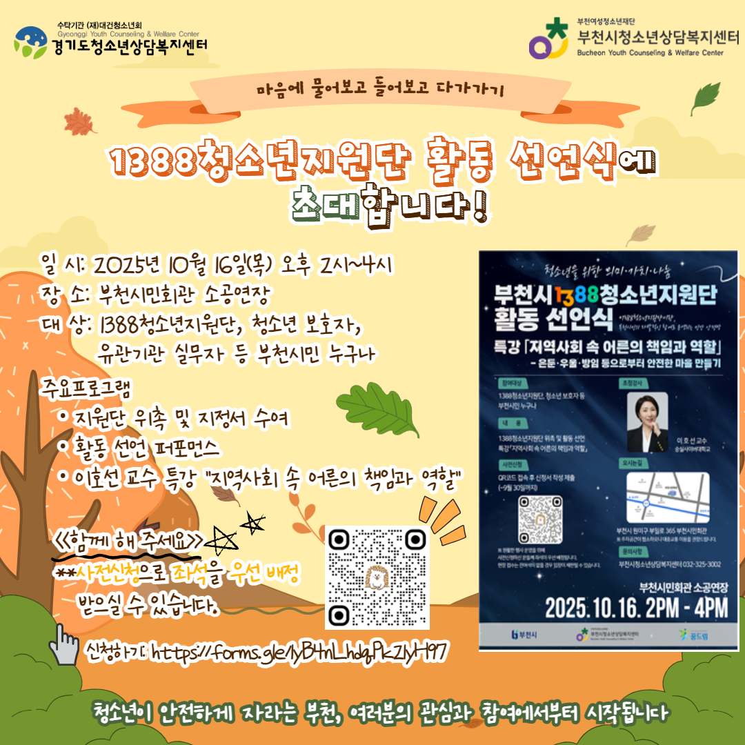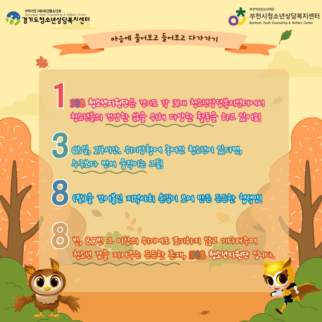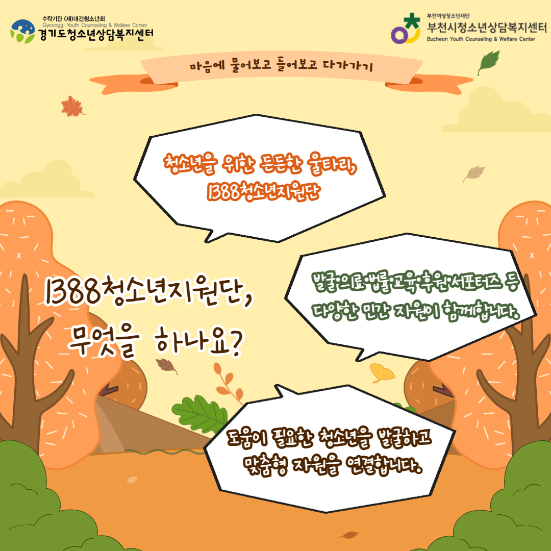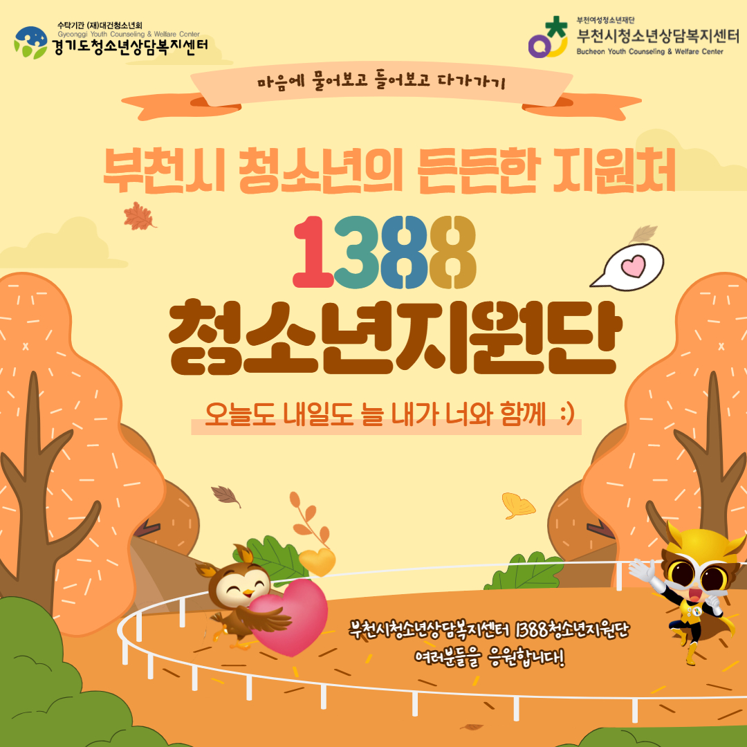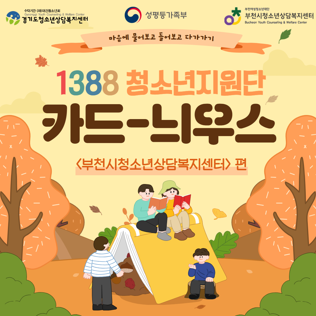 사이트 전체메뉴 유형별 서비스 우리동네 청소년안전망 우리동네 청소년안전망 맞춤서비스 검색 맞춤서비스 검색 알림마당 공지사항 이벤트 상담도서관 이벤트 게시판 상담신청/웹심리검사 소개 청소년 안전망 1388 청소년지원단 실무자 게시판 홍보게시판 문의하기 닫기